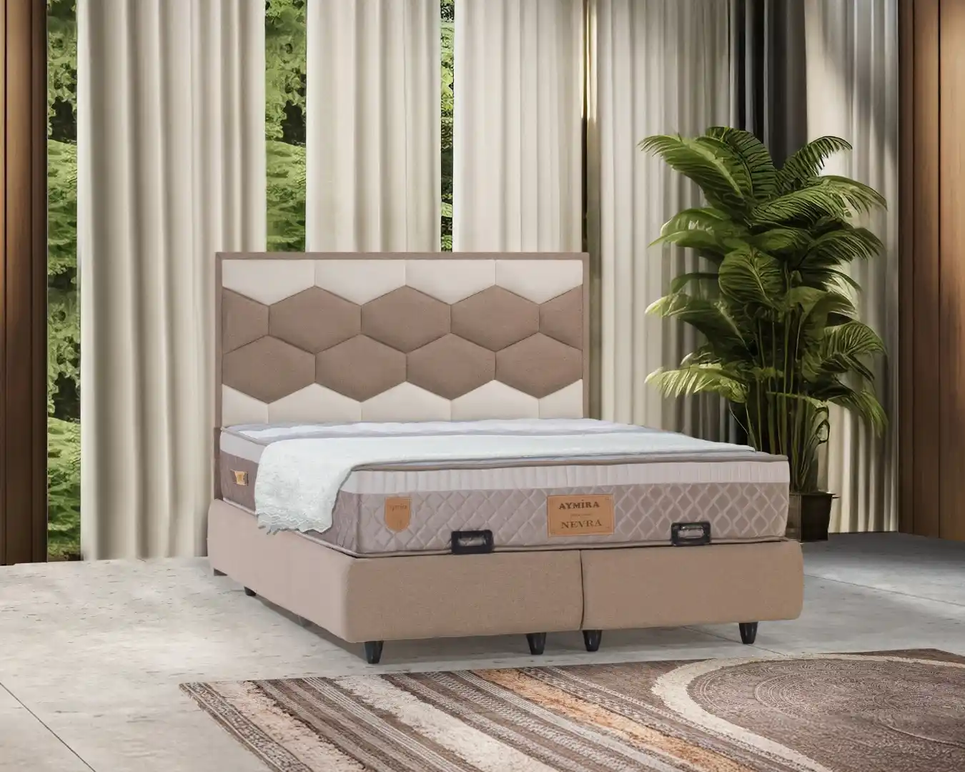 Aymira Petek, doğal tonları, modern ve yaratıcı altıgen desenli başlık tasarımı ve üstün uyku konforunu birleştirerek, yatak odasında hem sanatsal bir dokunuş hem de huzurlu bir dinlenme ortamı yaratmak isteyenler için mükemmel bir seçimdir.
